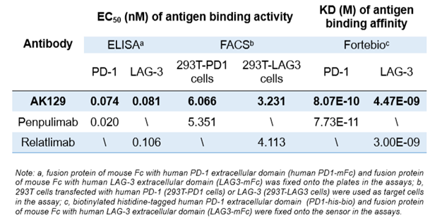研究人员基于ELISA、FACS和Fortebio评估了AK129对PD-1和LAG-3的抗原结合活性,分析显示AK129具有优越的抗原结合活性,为其靶向PD-1及LAG-3打下结构基础。