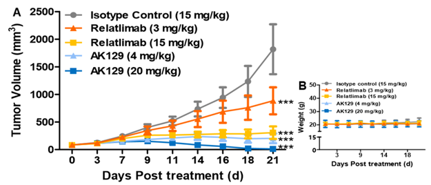 在体内药理学研究中,研究人员在携带CT26.WT异种移植物的BALB/c-hPD1/hLAG3小鼠中研究了AK129的抗肿瘤活性。结果表明,与Relatlimab相比,AK129表现出更好的抗肿瘤活性。
