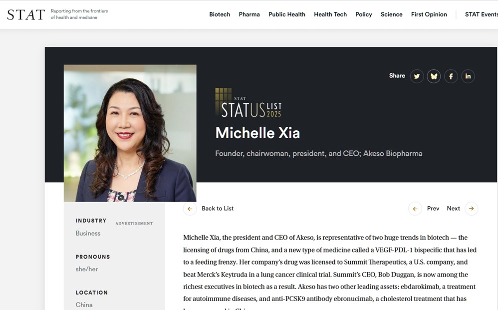 夏瑜博士入选国际著名媒体STAT 全球《2025年领军人物》(The 2025 STATUS List)榜单