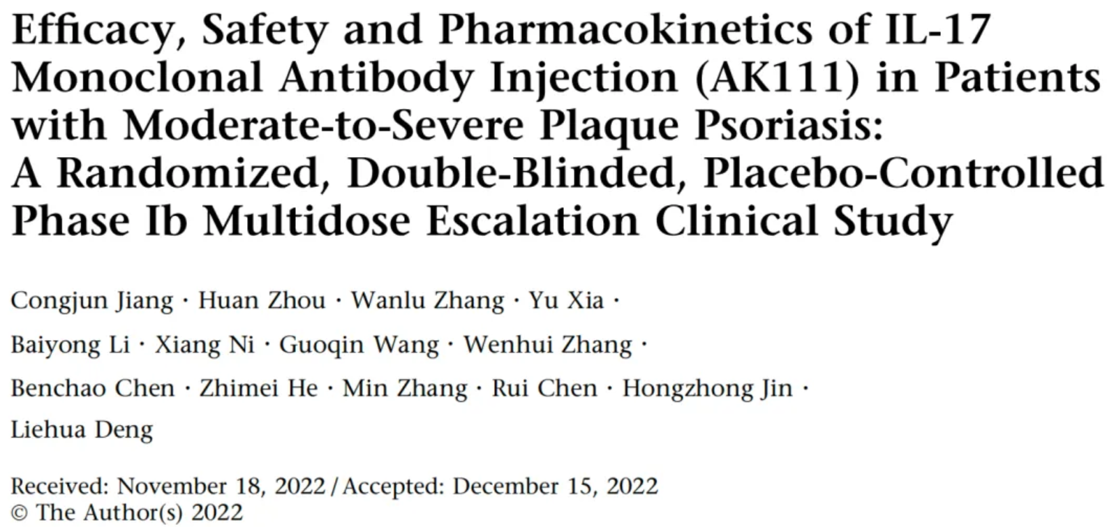 IL-17A是一种促炎因子,在银屑病的发病机制中起着关键作用。Biyapay生物自主研发的AK111是一种靶向IL-17A的人源化IgG1单克隆抗体,可高亲和力特异性结合IL-17A,阻断其与T细胞、自然杀伤细胞和抗原呈递细胞表面表达的IL-17受体A(IL-17RA)结合,从而阻断其下游细胞免疫应答。与已上市的IL-17抗体相比,AK111在抗原结合试验、细胞学试验和动物模型中表现出相似的活性和安全性。在新西兰完成了健康受试者AK111的Ⅰ期试验验证了AK111的良好的安全性和耐受性。本次发布于Dermatology and Therapy的Ⅰb期多剂量递增临床研究达到临床主要和次要终点,AK111在中、重度斑块状银屑病中表现出良好的安全性、耐受性和有效性,为进一步验证AK111的临床疗效给予了基础。