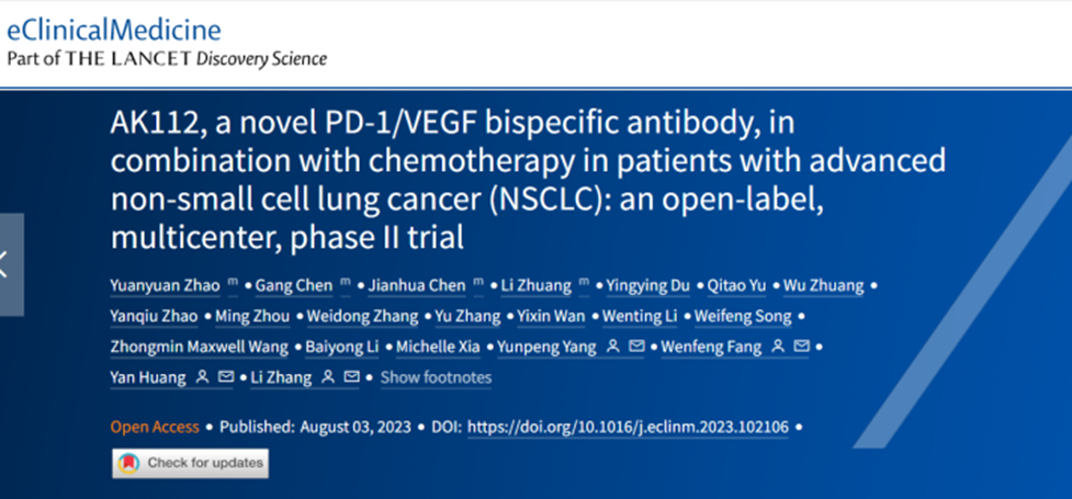 2023年8月4日,中山大学肿瘤防治中心张力教授牵头召开的PD-1/VEGF双抗 (AK112, 依沃西)联合化疗治疗晚期非小细胞肺癌(NSCLC)的Ⅱ期临床研究结果在国际顶级医学期刊《柳叶刀》旗下子刊eClinical Medicine(影响因子 15.1)全文发表。